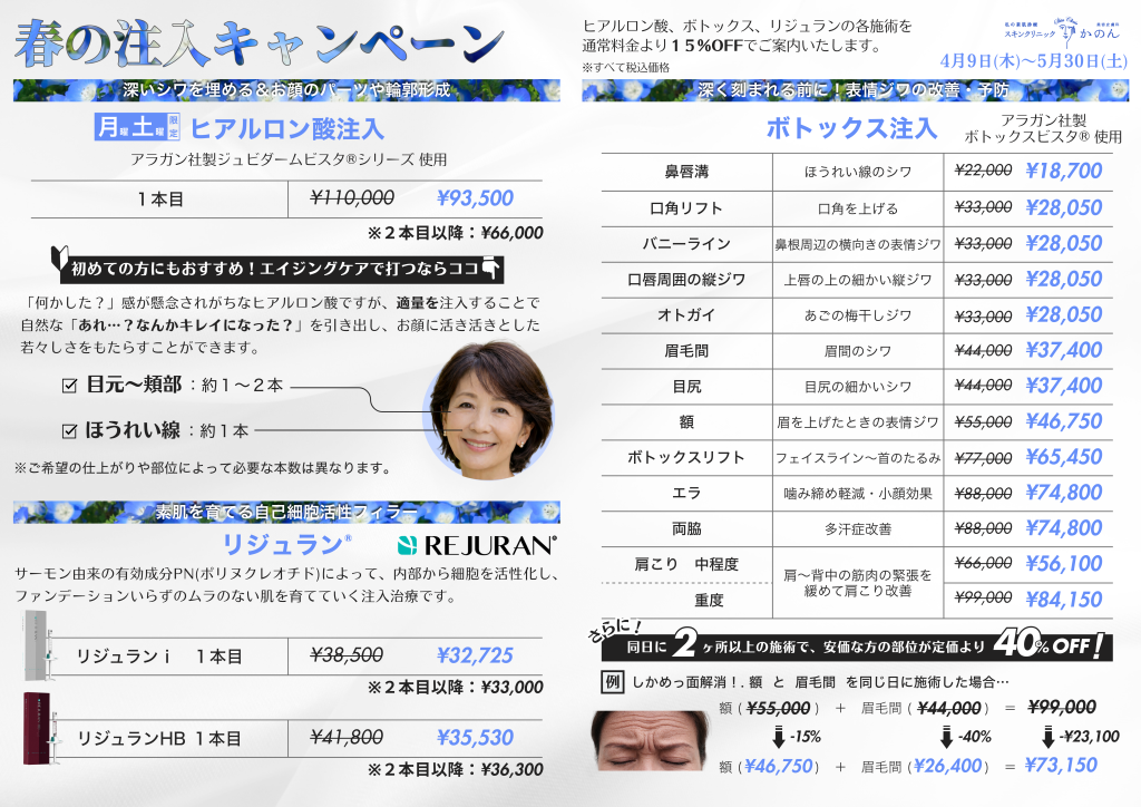 ヒアルロン酸・ボトックス・リジュランの各施術を、通常料金より15%OFFにてご案内いたします。